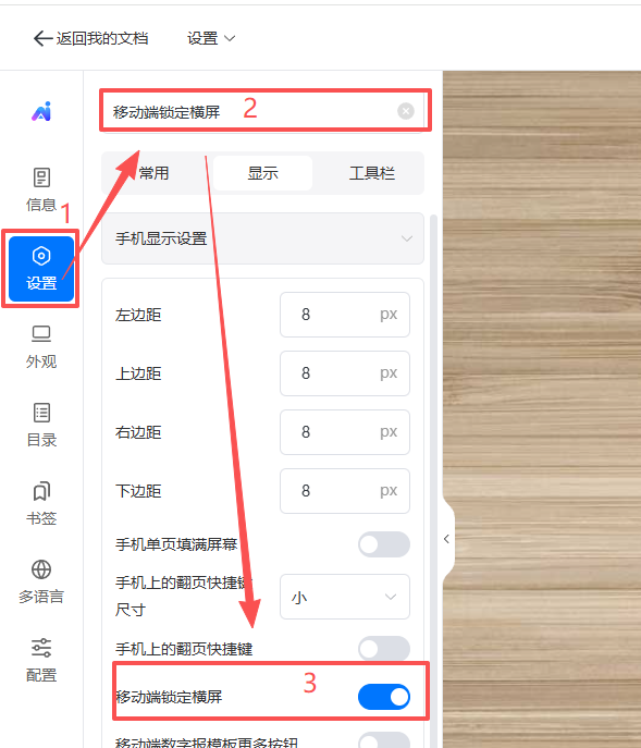 當(dāng)上傳橫版的電子書時(shí),手機(jī)端豎屏查看效果不佳。您可以設(shè)置移動端鎖定橫屏功能,無需手動調(diào)整,手機(jī)打開電子書時(shí)屏幕將自動切換為橫屏模式查看。