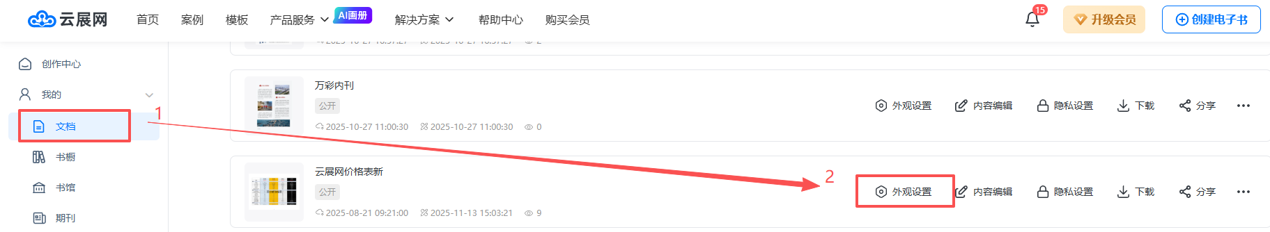 在【文檔】頁面,找到需要設(shè)置的書籍,點(diǎn)擊【外觀設(shè)置】進(jìn)入。