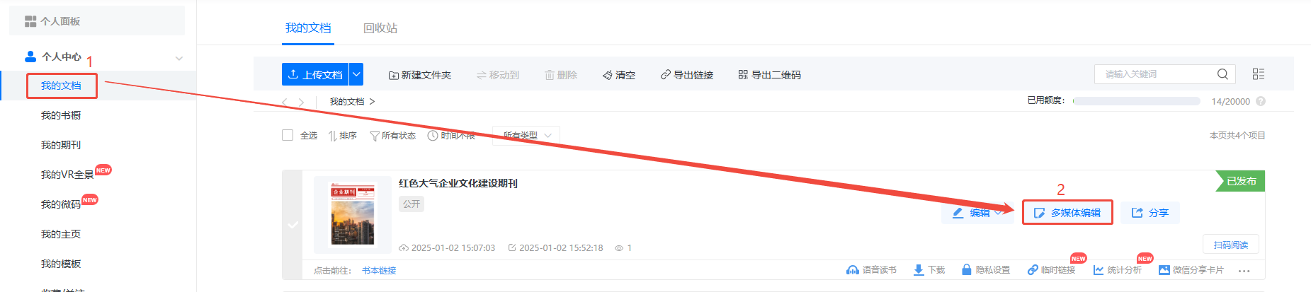 點進【我的文檔】/【文檔】,選擇對應電子書,點擊【多媒體編輯】/【內(nèi)容編輯】。