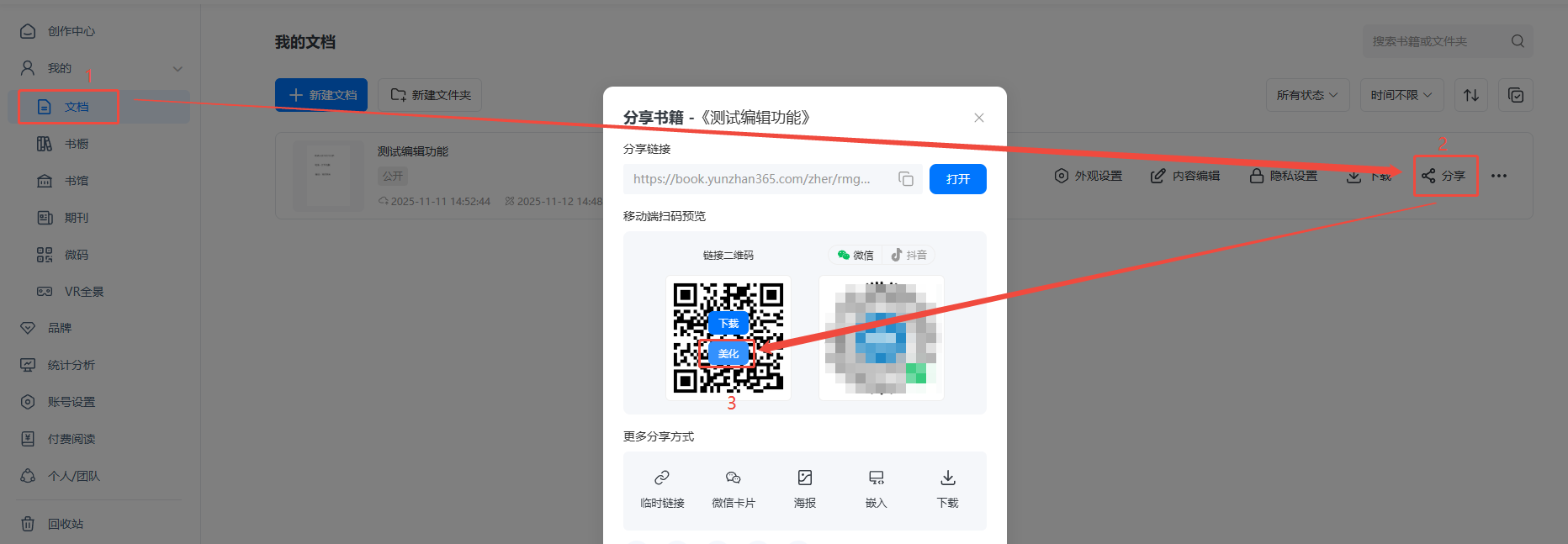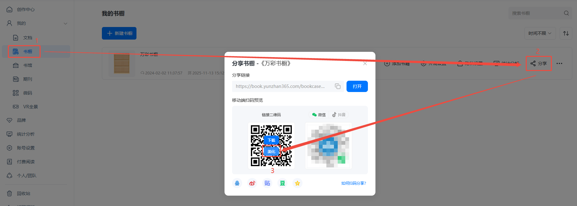 如果需要美化書本/書櫥的二維碼,點(diǎn)進(jìn)【文檔】/【書櫥】,然后點(diǎn)擊【分享】,將鼠標(biāo)移動到鏈接二維碼上點(diǎn)擊【美化】。