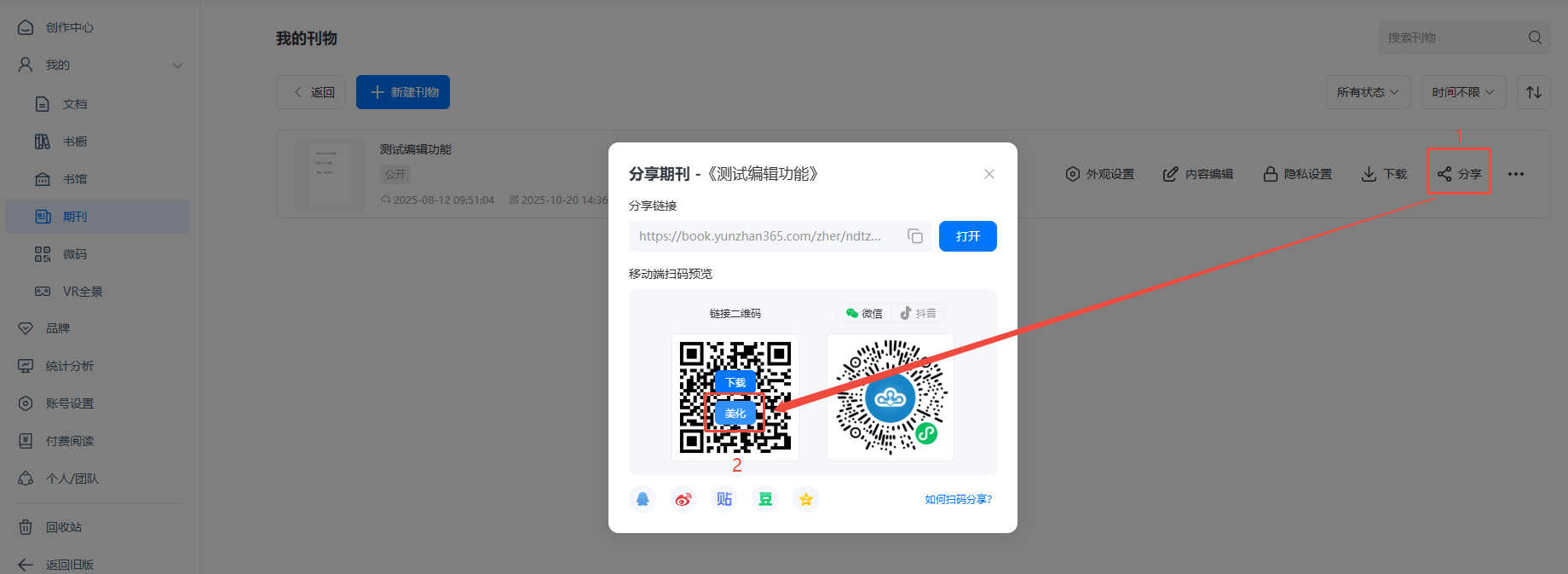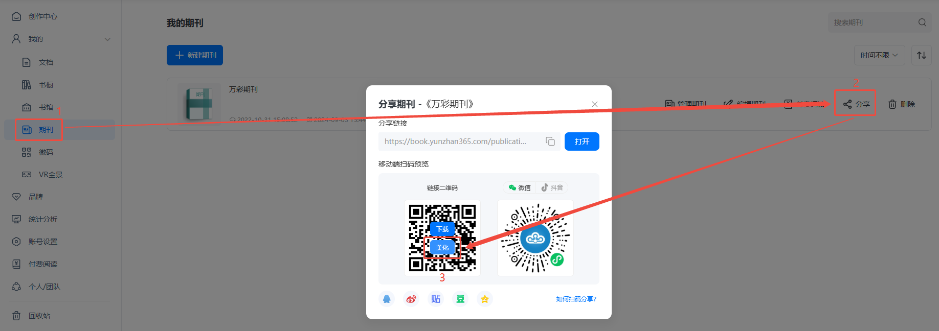 如果需要美化期刊集的二維碼,點(diǎn)進(jìn)【期刊】,點(diǎn)擊對應(yīng)期刊集的【分享】,將鼠標(biāo)移動到鏈接二維碼上點(diǎn)擊【美化】。