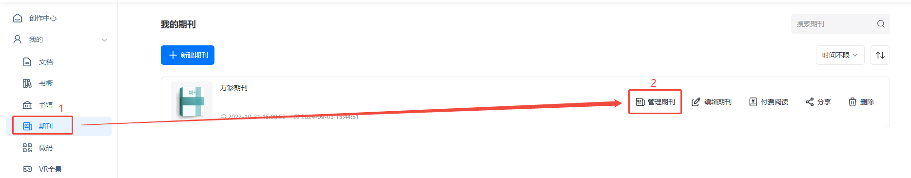 如果需要美化刊物的二維碼,點(diǎn)進(jìn)【期刊】,然后點(diǎn)擊期刊集的【管理期刊】,最后點(diǎn)擊刊物的【分享】,將鼠標(biāo)移動到鏈接二維碼上點(diǎn)擊【美化】。