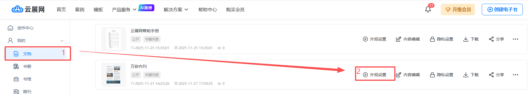 點擊【文檔】,選擇需要設(shè)置的電子畫冊,點擊【外觀設(shè)置】。