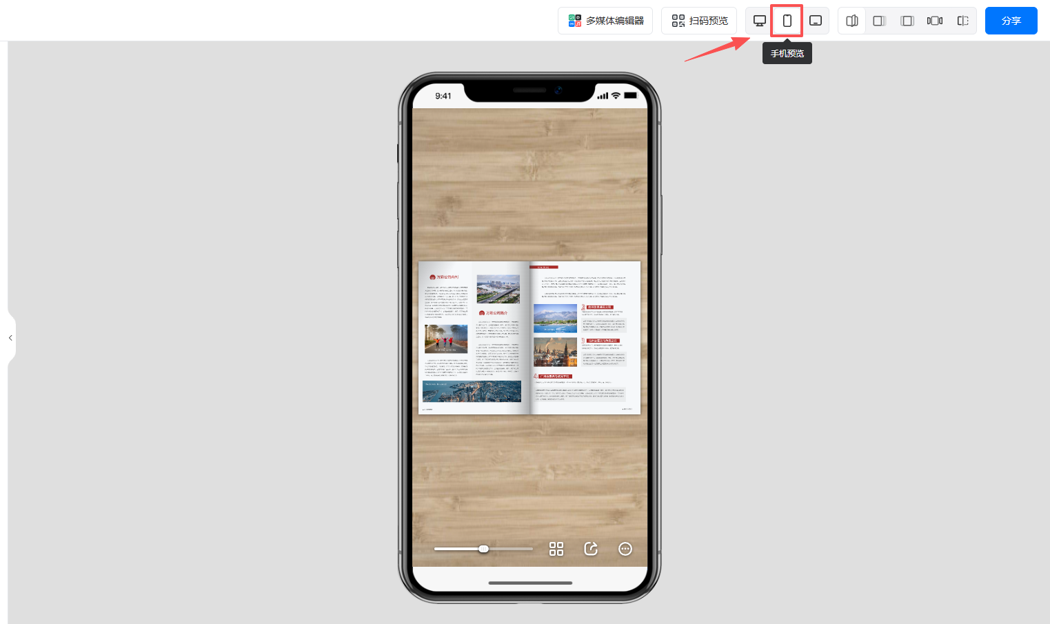 點擊右上角的手機預(yù)覽按鈕,可查看手機端豎屏雙頁效果