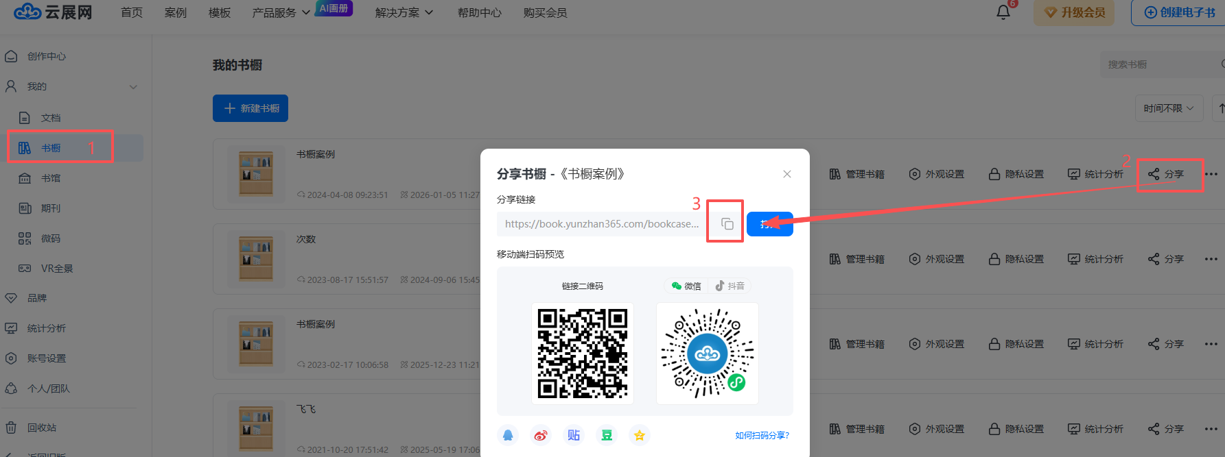 點擊【書櫥】,點擊【分享】后復制書櫥鏈接。如這個書櫥鏈接為:https://baijingtest.sharedbook.cn/bookcase/qbba/index.html