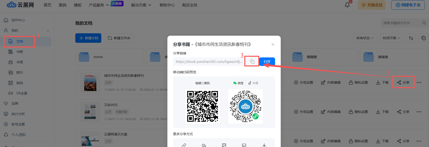 點擊【文檔】,點擊【分享】后復制書本鏈接,如這本書的鏈接為https://book.yunzhan365.com/kykh/tppo/mobile/index.html