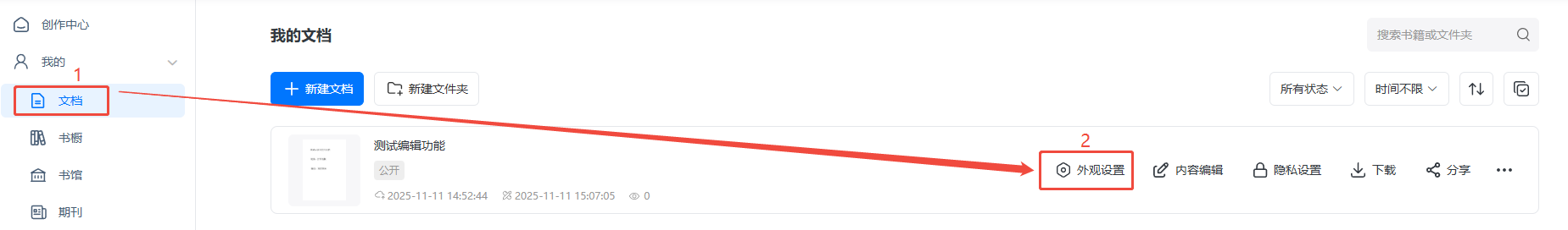 點擊【文檔】,找到對應(yīng)電子畫冊,點擊【外觀設(shè)置】。