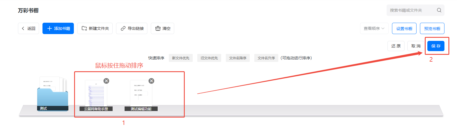 先點(diǎn)擊【排序】,然后直接鼠標(biāo)按住電子畫冊(cè)拖曳排序,最后點(diǎn)擊【保存】即可。