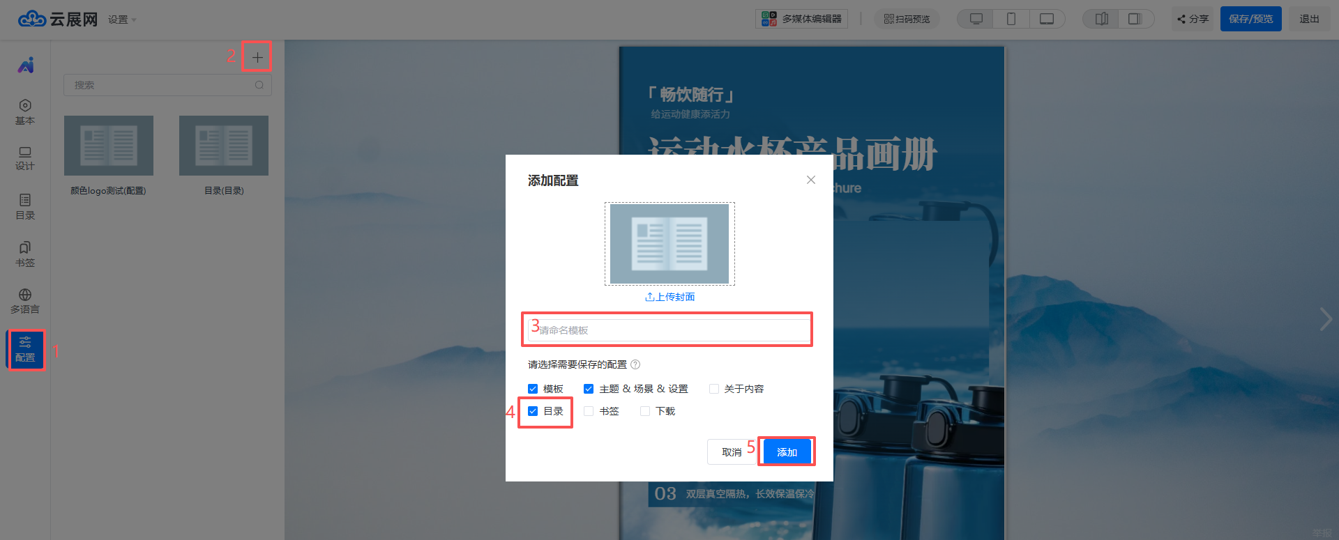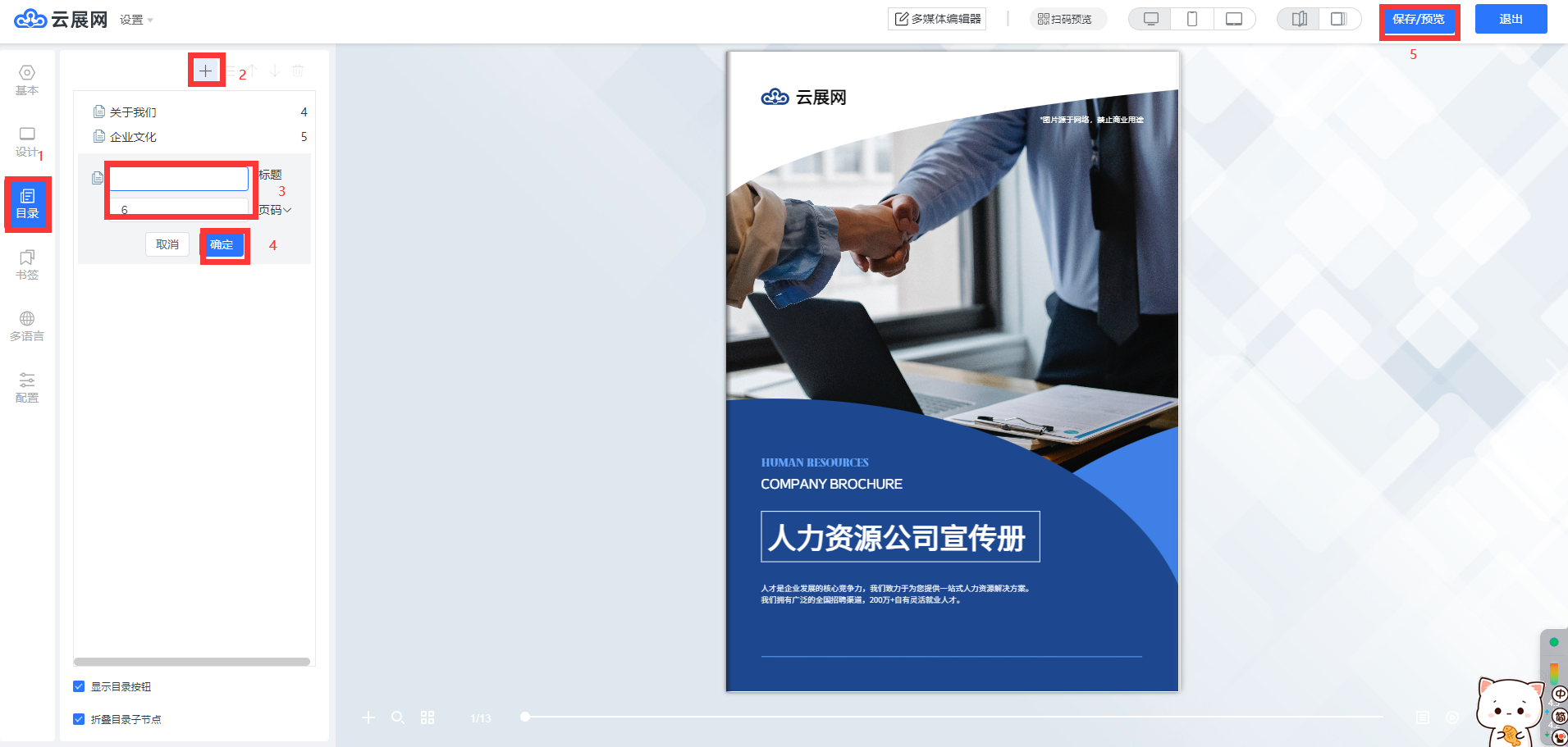 選擇【目錄】,點擊【+】按鈕,即可設置標題,頁碼。添加好所有目錄后點擊保存預覽。