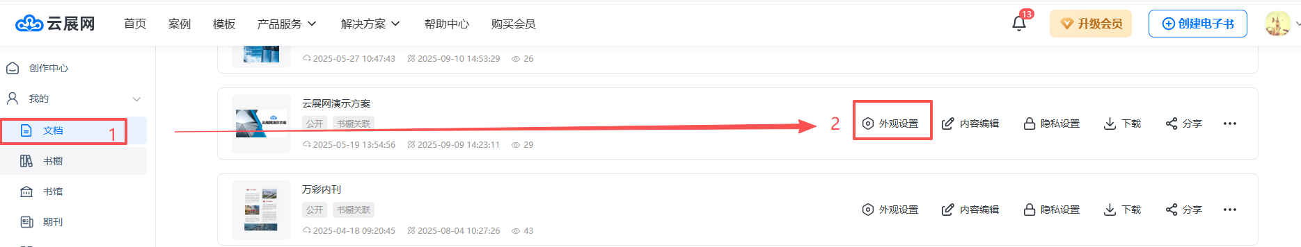 在【文檔】中找到需要添加目錄的雜志,點擊【外觀設置】打開