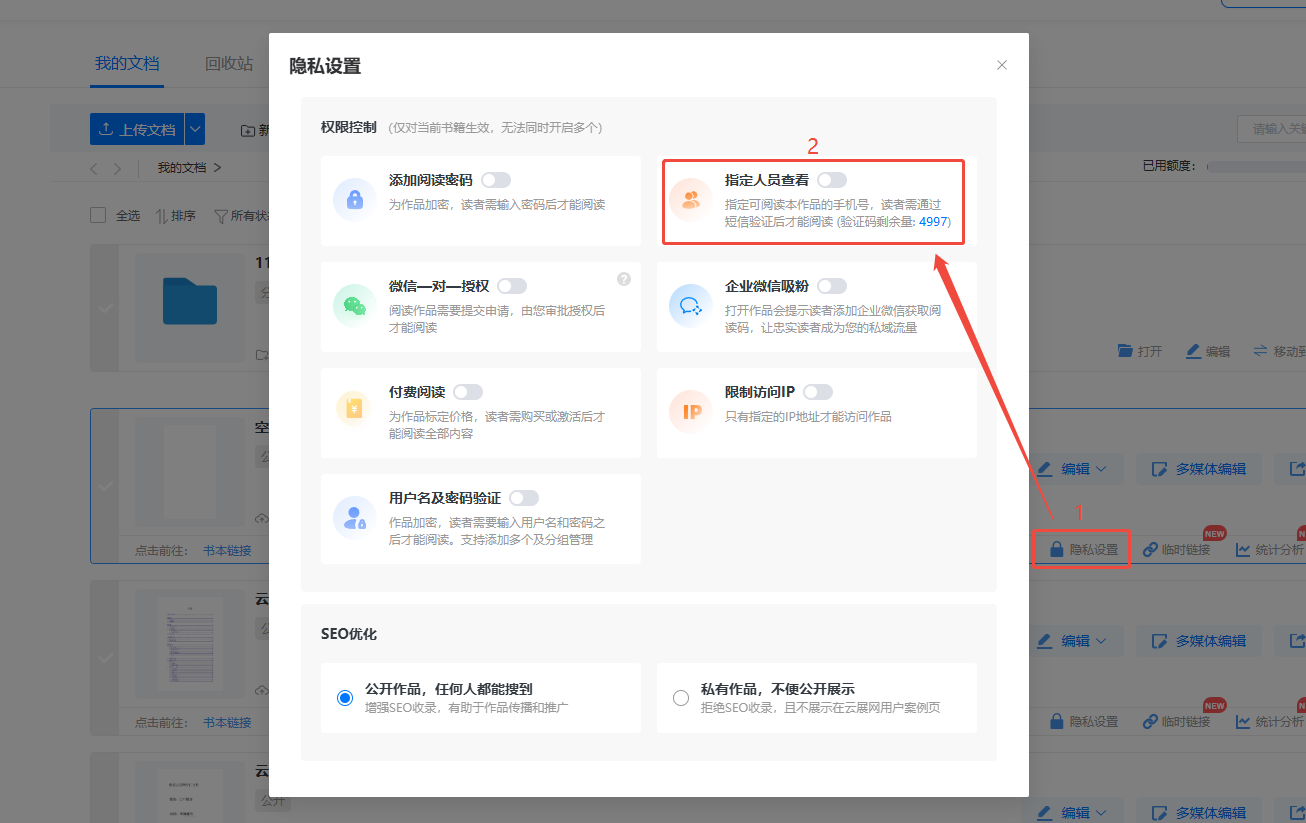 找到需要設(shè)置指定人員查看的電子書,點(diǎn)擊【隱私設(shè)置】。開啟【指定人員查看】選項(xiàng)。