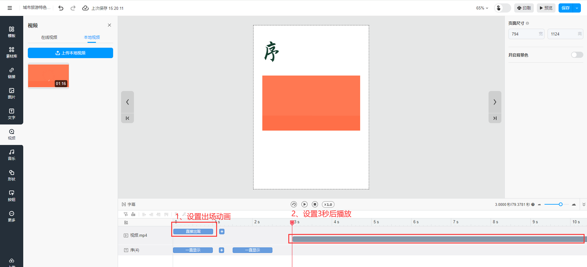 在時間軸設(shè)置視頻出現(xiàn)的時間,比如0-3S之間給視頻設(shè)置一個出場動畫,然后到第3秒的時候開始播放視頻