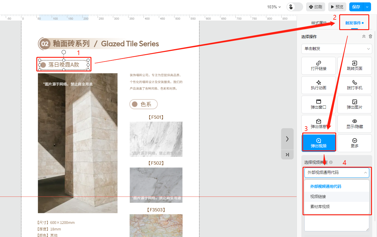 選中需要彈出視頻的文字或者圖片,然后在【觸發(fā)事件】選擇【彈出視頻】,選擇視頻類型。