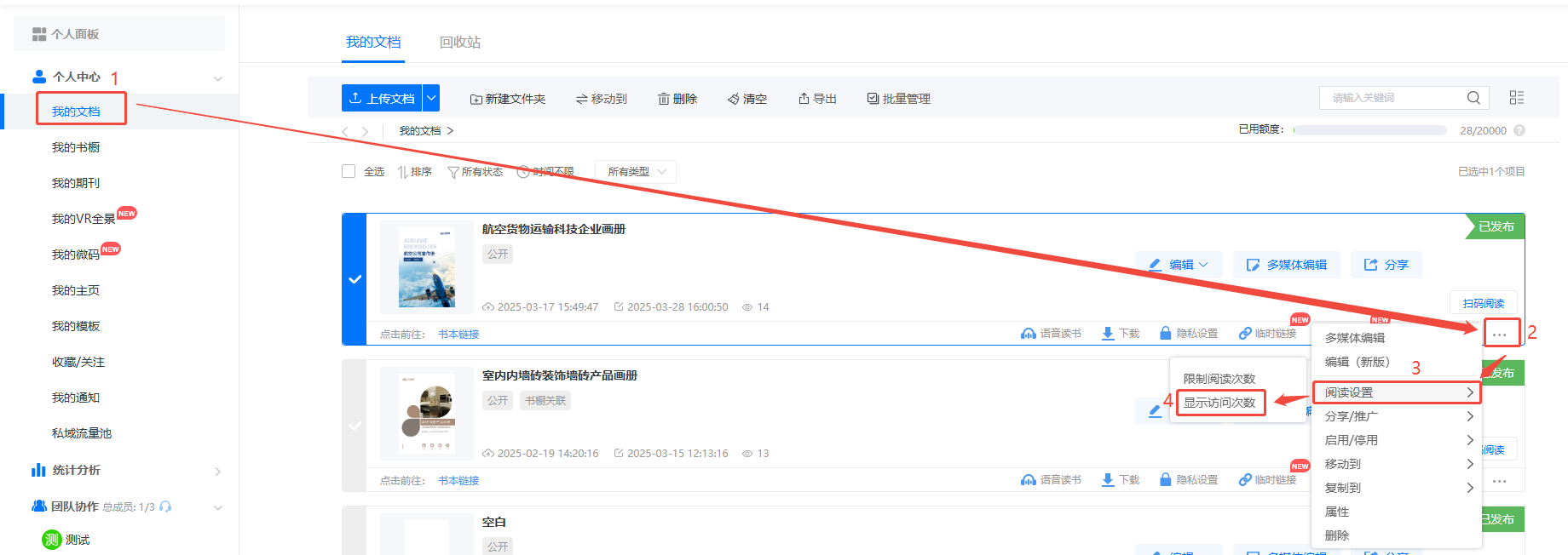 點(diǎn)擊【我的文檔】,找到需要設(shè)置的書本,點(diǎn)擊右邊三個(gè)點(diǎn),再點(diǎn)擊【閱讀設(shè)置】,最后點(diǎn)擊【顯示訪問次數(shù)】。