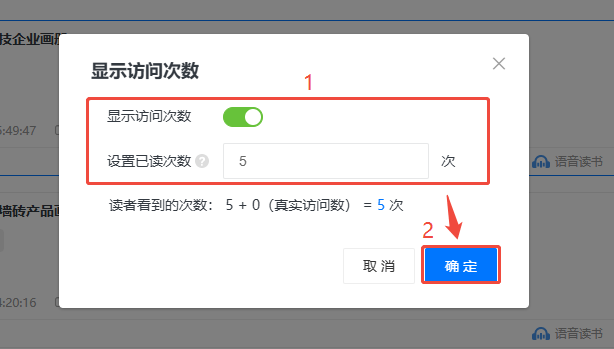打開【顯示訪問次數(shù)】,設(shè)置已讀次數(shù)后點(diǎn)擊確定,書本上顯示的最終數(shù)值為:填寫的數(shù)值+真實(shí)的訪問次數(shù)。