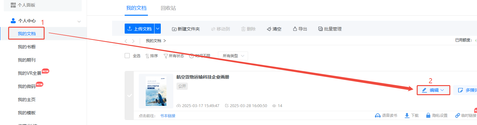 點(diǎn)擊【我的文檔】,然后點(diǎn)擊【編輯】,打開編輯界面。
