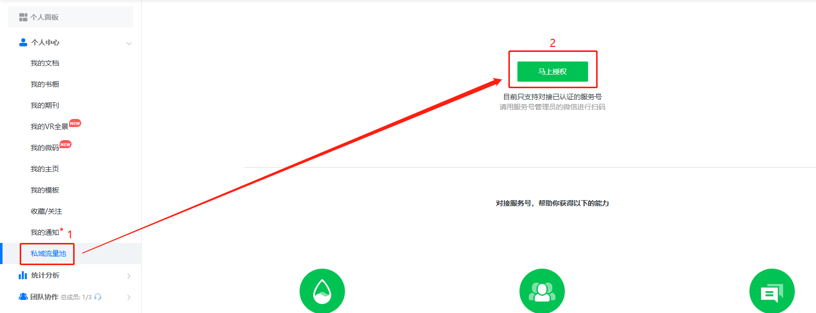 點(diǎn)擊私域流量池,再點(diǎn)擊馬上授權(quán),使用公眾平臺(tái)綁定的管理員個(gè)人微信號(hào)掃描二維碼進(jìn)行授權(quán)。