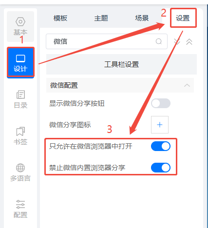 點擊【設計】,然后點擊【設置】,將【只允許在微信瀏覽器中打開】和【禁止微信內(nèi)置瀏覽器分享】打都打開。