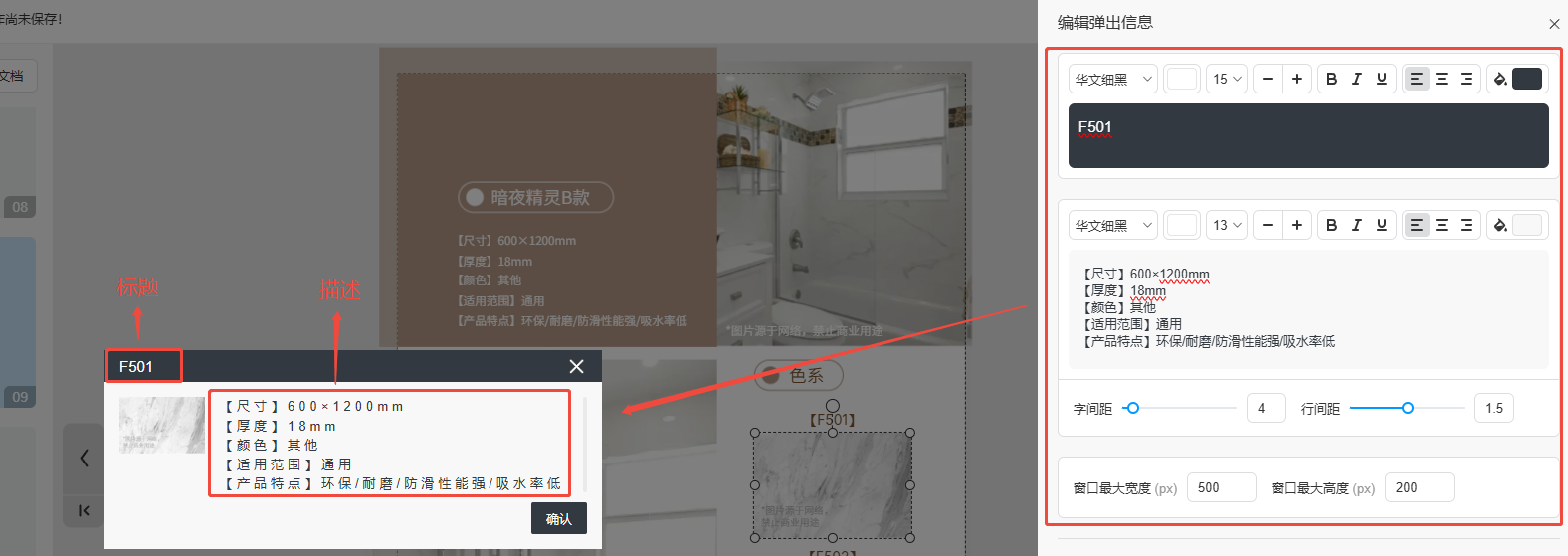 注意:標題和描述支持單獨對某個文字設(shè)置大小、顏色、加粗、斜體、下劃線等樣式。