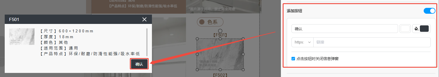 右側(cè)打開【添加按鈕】,輸入按鈕名稱和點擊按鈕跳轉(zhuǎn)的鏈接,調(diào)整文字樣式,按鈕背景色,勾選【點擊按鈕時關(guān)閉信息彈窗】。