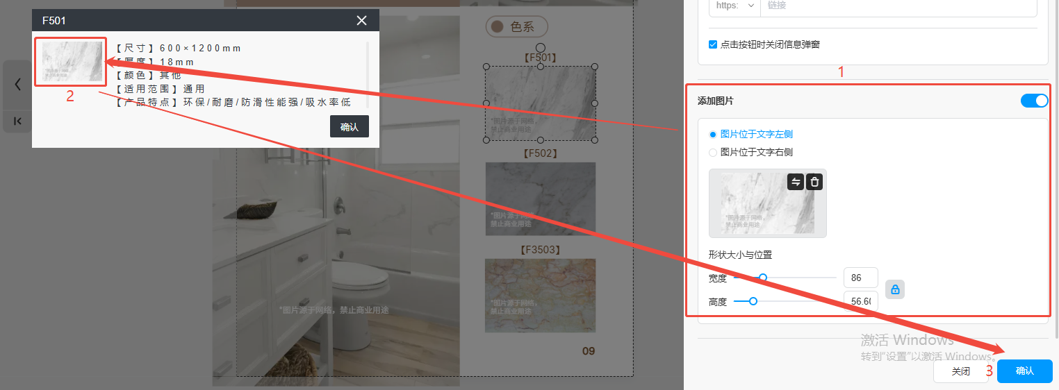 右側(cè)打開【添加圖片】,上傳圖片,設(shè)置顯示文字和調(diào)整大小,點擊右下角【確認】。