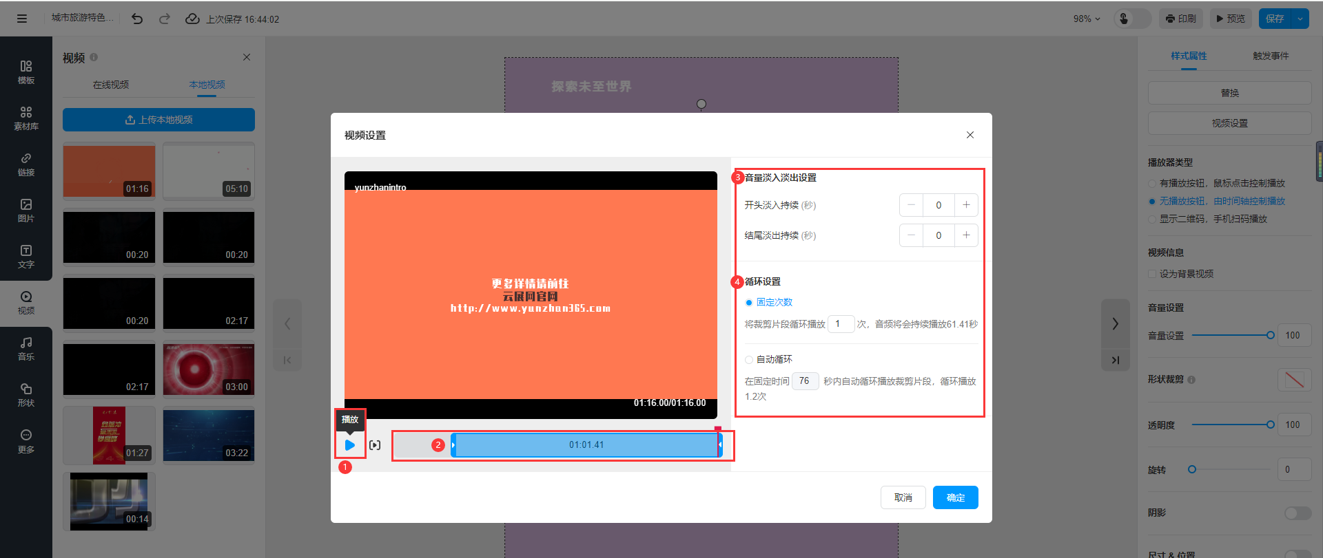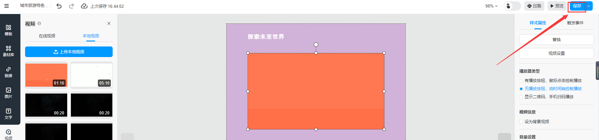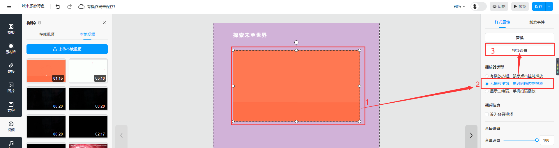 選中本地視頻,選擇【無播放按鈕,由時間軸控制播放】,然后點擊【視頻設(shè)置】
