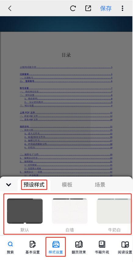 點(diǎn)擊【樣式設(shè)置】,然后點(diǎn)擊【預(yù)設(shè)樣式】,可以看到云展網(wǎng)提供的背景圖,根據(jù)自身喜好選擇即可,左滑可以查看更多背景圖。