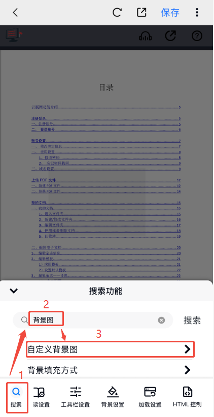點(diǎn)擊左下角【搜索】,在搜索框輸入【背景圖】,然后點(diǎn)擊【自定義背景圖】即可上傳自己的圖片,上傳后點(diǎn)擊右上角【保存】即可。
