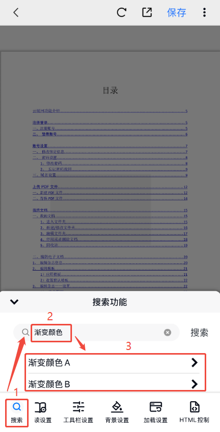 點(diǎn)擊左下角【搜索】,在搜索框輸入【漸變顏色】,然后點(diǎn)擊【漸變顏色A】或者【漸變顏色B】,選擇顏色以及調(diào)整漸變角度后,點(diǎn)擊右上角【保存】即可。