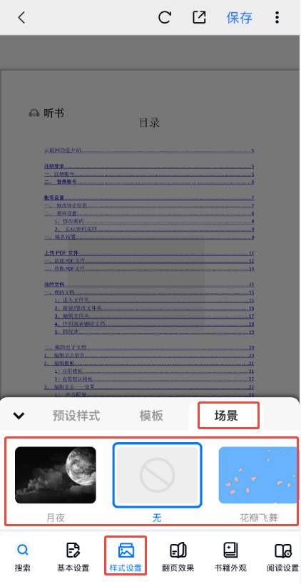 點(diǎn)擊【樣式設(shè)置】,然后點(diǎn)擊【場景】,可以看到云展網(wǎng)提供的動(dòng)態(tài)背景,根據(jù)自身喜好選擇即可,左滑可以查看更多場景。