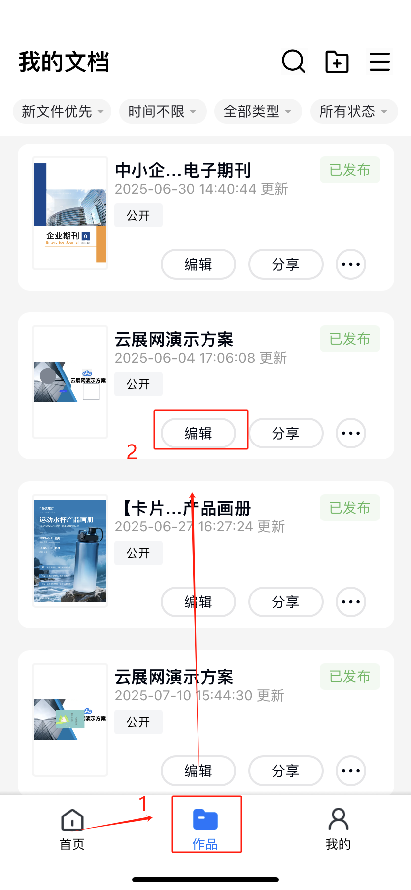 點擊【作品】打開,點擊【編輯】進(jìn)入