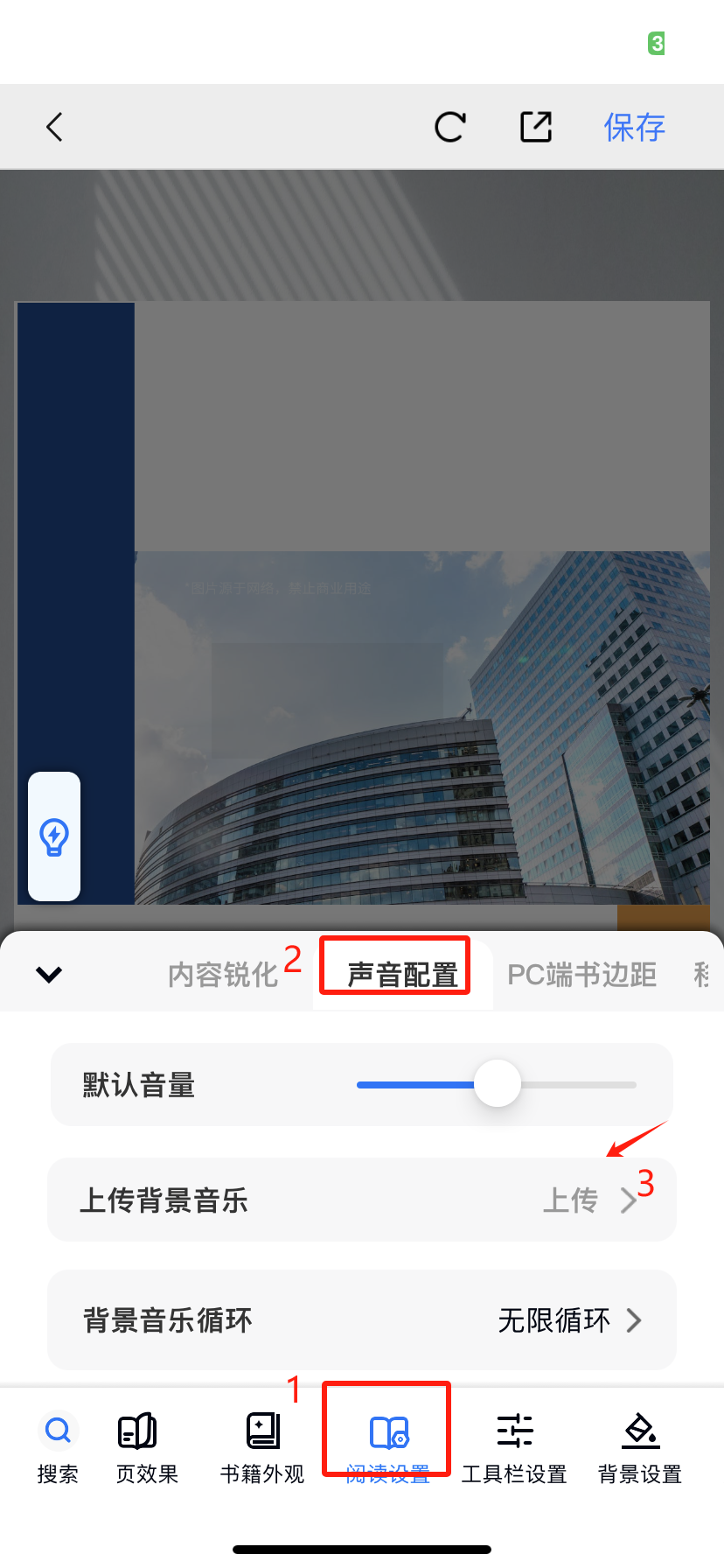 在【閱讀設(shè)置】,點擊【聲音配置】,點擊【上傳背景音樂】上傳mp3格式的音樂文件