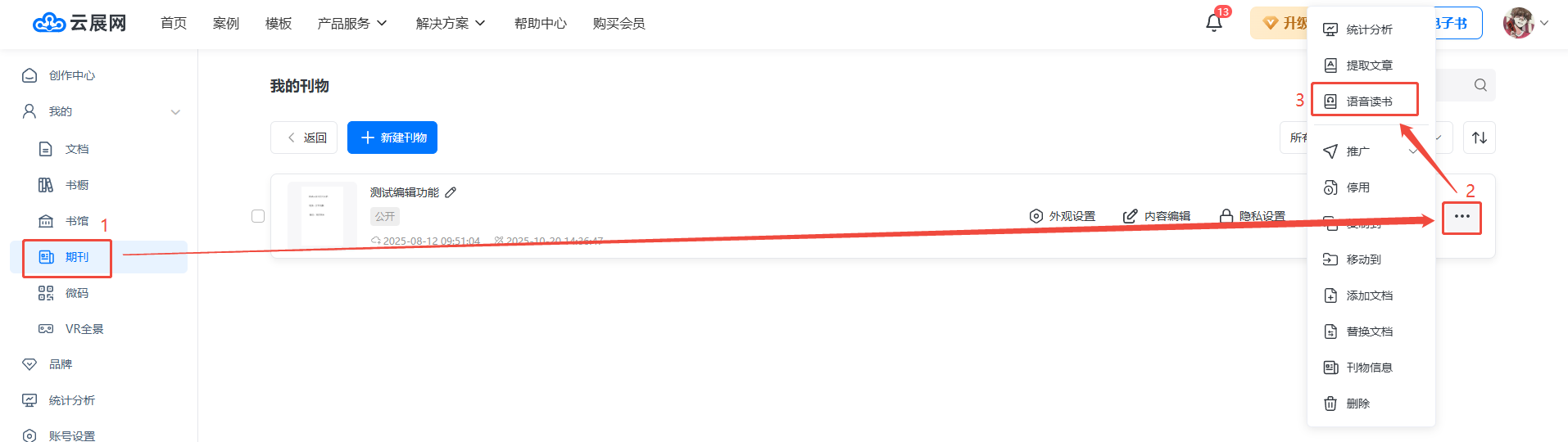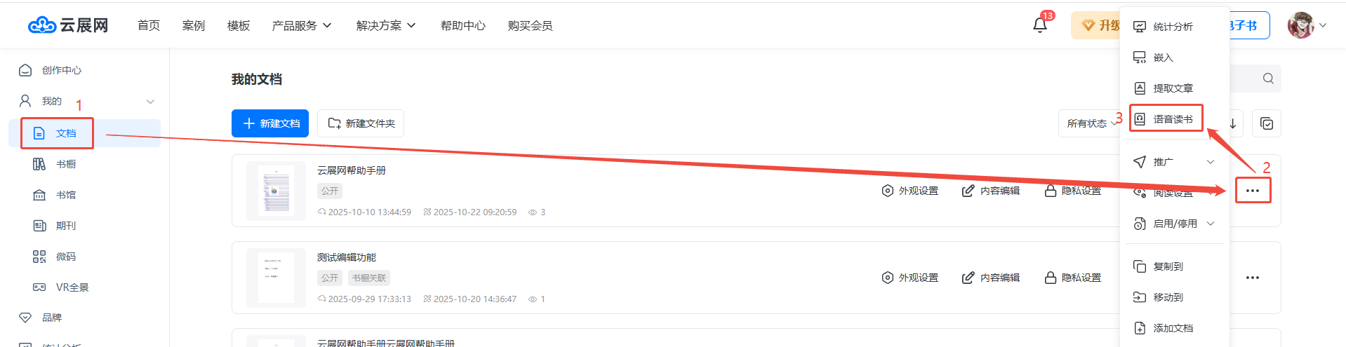 點(diǎn)擊【文檔】或【期刊】找到需要設(shè)置的書,點(diǎn)擊右方三個(gè)點(diǎn),然后點(diǎn)擊【語音讀書】。