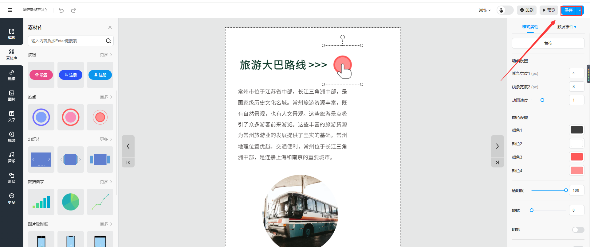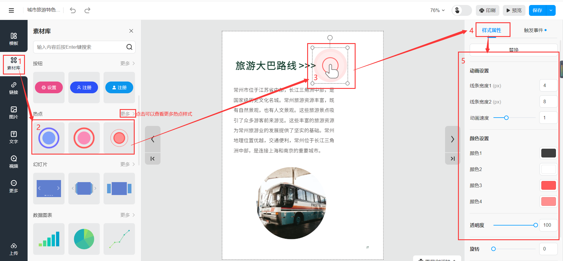 點(diǎn)擊【素材庫(kù)】,選擇【熱點(diǎn)】添加在頁(yè)面合適的位置上,右側(cè)點(diǎn)擊【樣式屬性】可更改熱點(diǎn)樣式