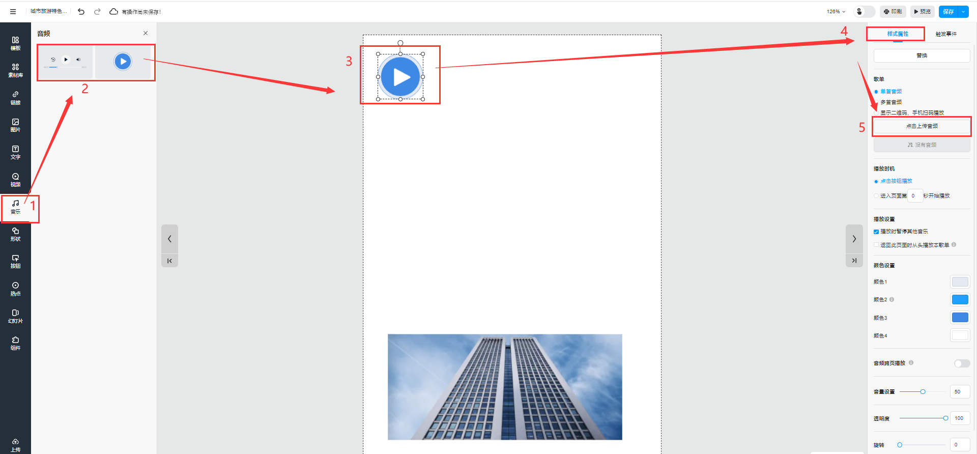 點擊【音樂】選擇音樂控件添加到頁面上,然后點擊【樣式屬性】,點擊【上傳音頻】,上傳mp3格式的音樂文件