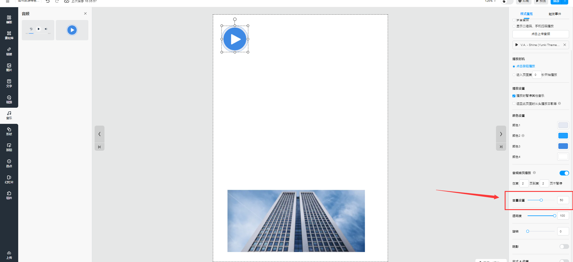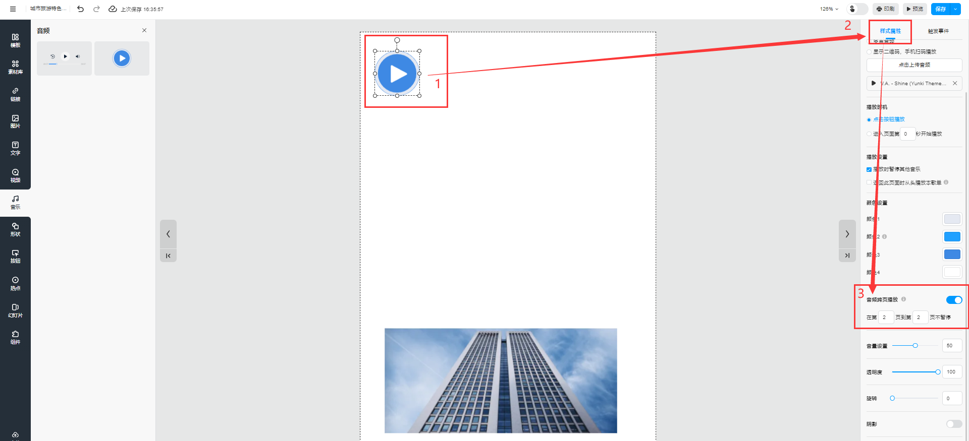 選中音頻播放器,點擊【樣式屬性】,勾選【音頻跨頁播放】,設(shè)置音頻跨頁播放的頁數(shù)