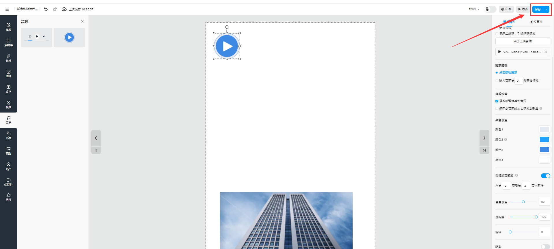 音頻跨頁播放設(shè)置好以后,點擊右上角【保存】即可