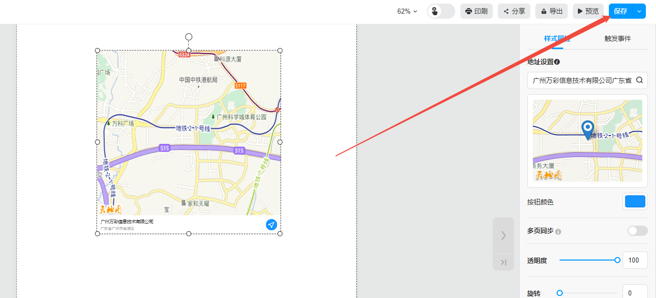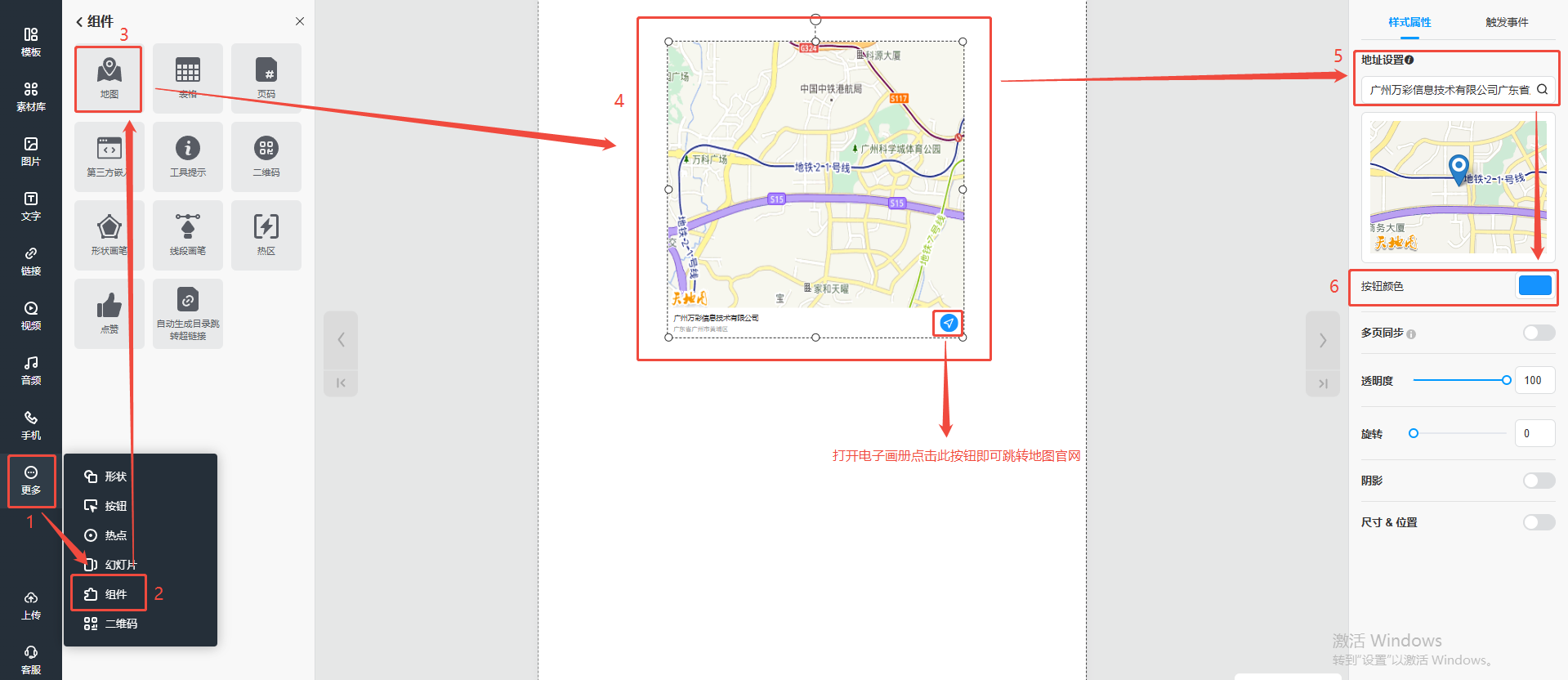點擊【更多】,選擇【組件】,然后點擊【地圖】,在頁面上就會出現(xiàn)一個地圖板塊,在右側(cè)【地址設(shè)置】輸入目的地,設(shè)置【按鈕顏色】即可。
