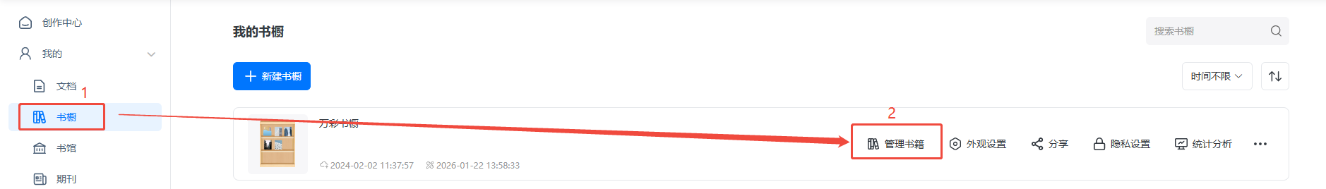 點(diǎn)擊【書櫥】,找到書櫥再點(diǎn)擊【管理書櫥】,進(jìn)入管理書櫥界面。
