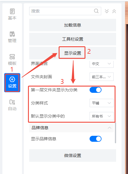 點(diǎn)擊【設(shè)置】,打開(kāi)【顯示設(shè)置】,找到并打開(kāi)【第一層文件夾顯示為分類】。
