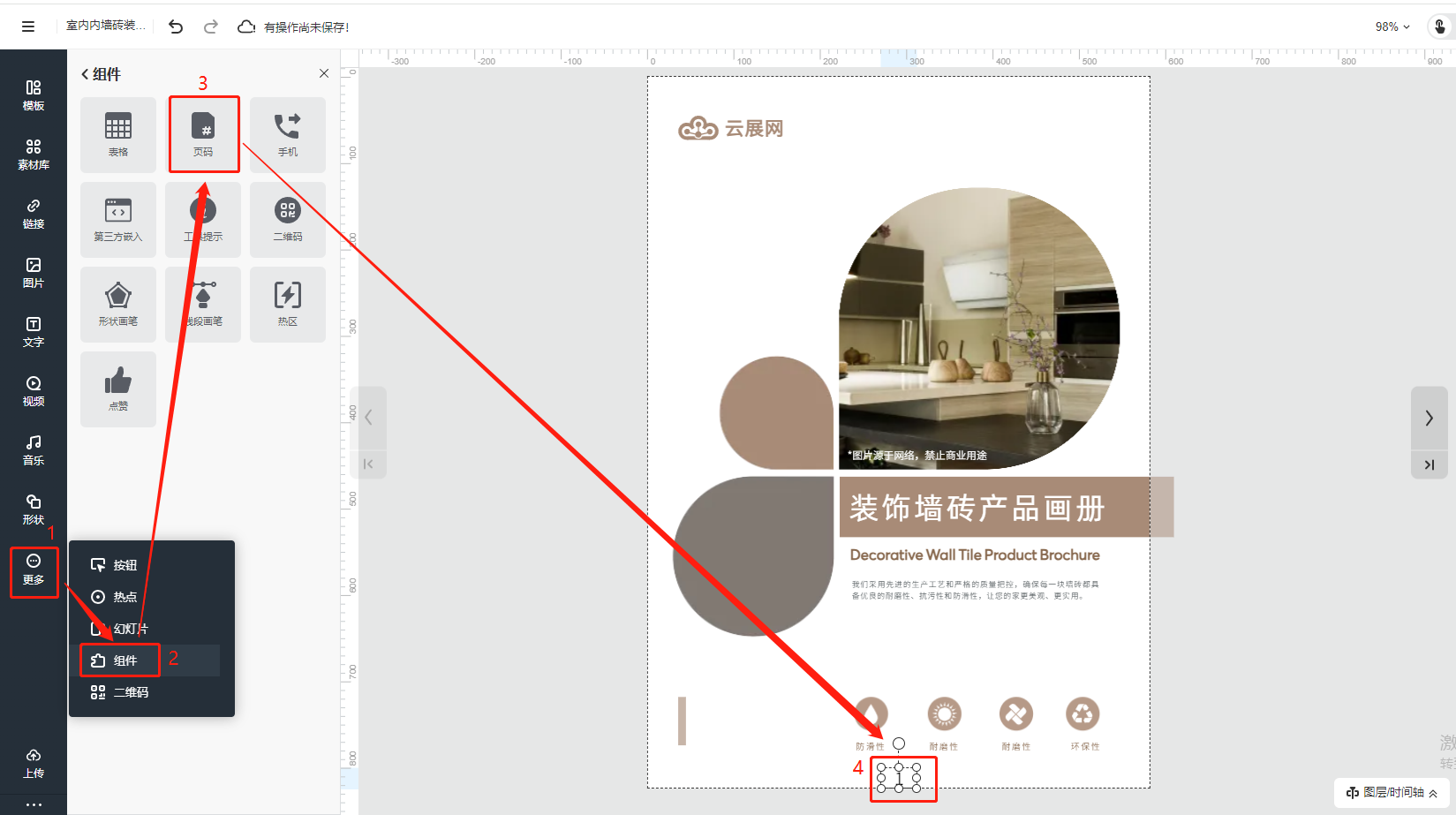 點擊【更多】,選擇【組件】,點擊【頁碼】,頁碼會自動按順序出現(xiàn)在所有的書本頁面上。