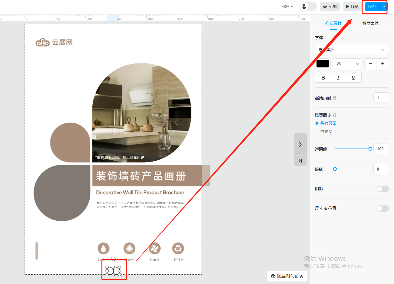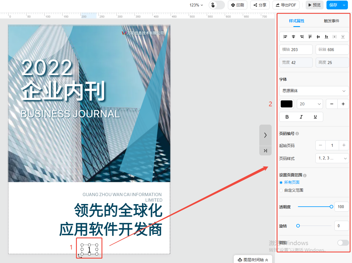 點擊某一頁的頁碼,在右側(cè)樣式屬性處可以設(shè)置頁碼樣式,可以選擇同步所有頁面的頁碼或者自定義頁面的頁碼。