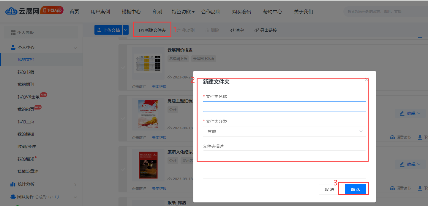 【我的文檔】頁面–點擊【新建文件夾】–輸入文件夾信息–點擊【確認】