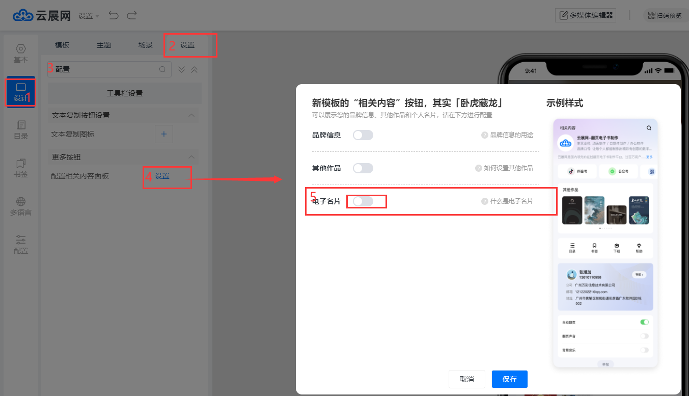點(diǎn)擊【設(shè)計】,點(diǎn)擊【設(shè)置】,在搜索欄輸入”配置”關(guān)鍵字查找,點(diǎn)擊【配置相關(guān)內(nèi)容面板】設(shè)置,開啟電子名片功能