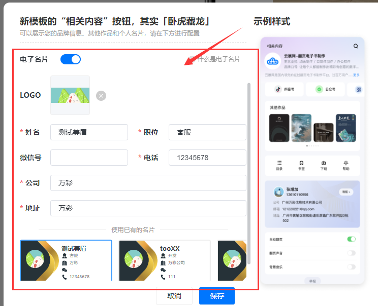 輸入【姓名】、【職位】、【微信號】、【電話】、【公司】、【地址】信息后,點(diǎn)擊【保存】
