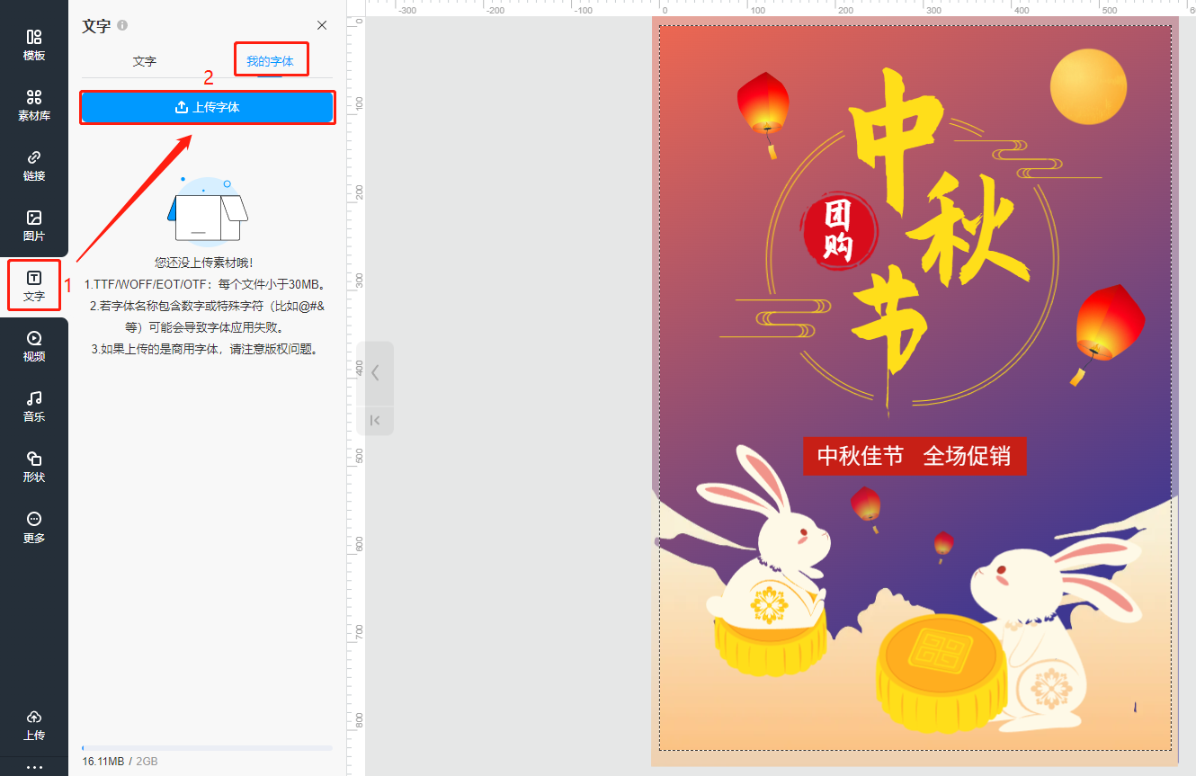 (1)可上傳的文件格式為:TTF/WOFF/EOT/OTF,文件大小需小于30M。