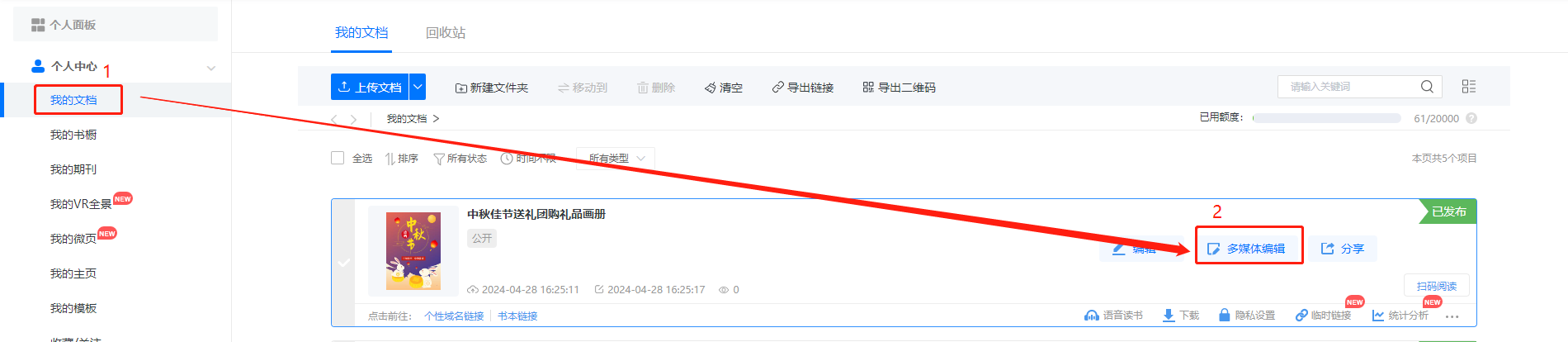 點進【我的文檔】/【文檔】,選擇對應電子書,點擊【多媒體編輯】/【內容編輯】。