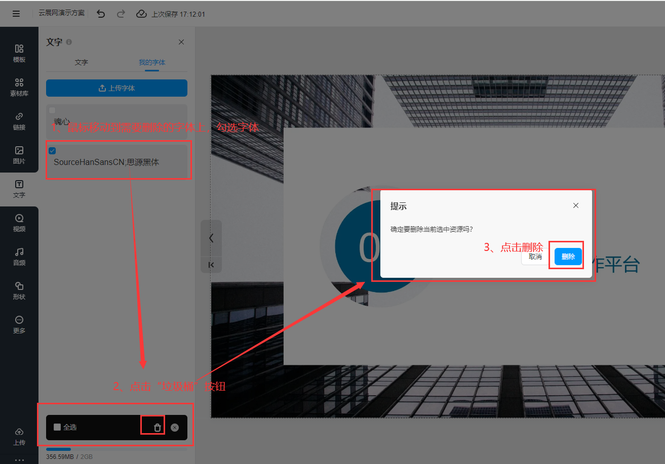 點擊【文字】,選擇【我的字體】,找到需要刪除的字體,勾選字體后點擊【刪除】,刪除后,之前使用這個字體的文字自動變更為思源黑體。