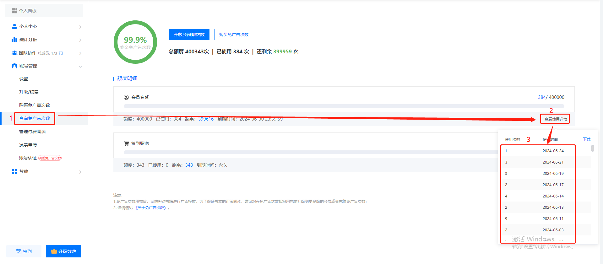 在【賬號管理】點擊【查詢免廣告次數(shù)】,再點擊【查看使用詳情】就可以看到您書本的總免廣告次數(shù)以及剩余的免廣告次數(shù),如下圖: