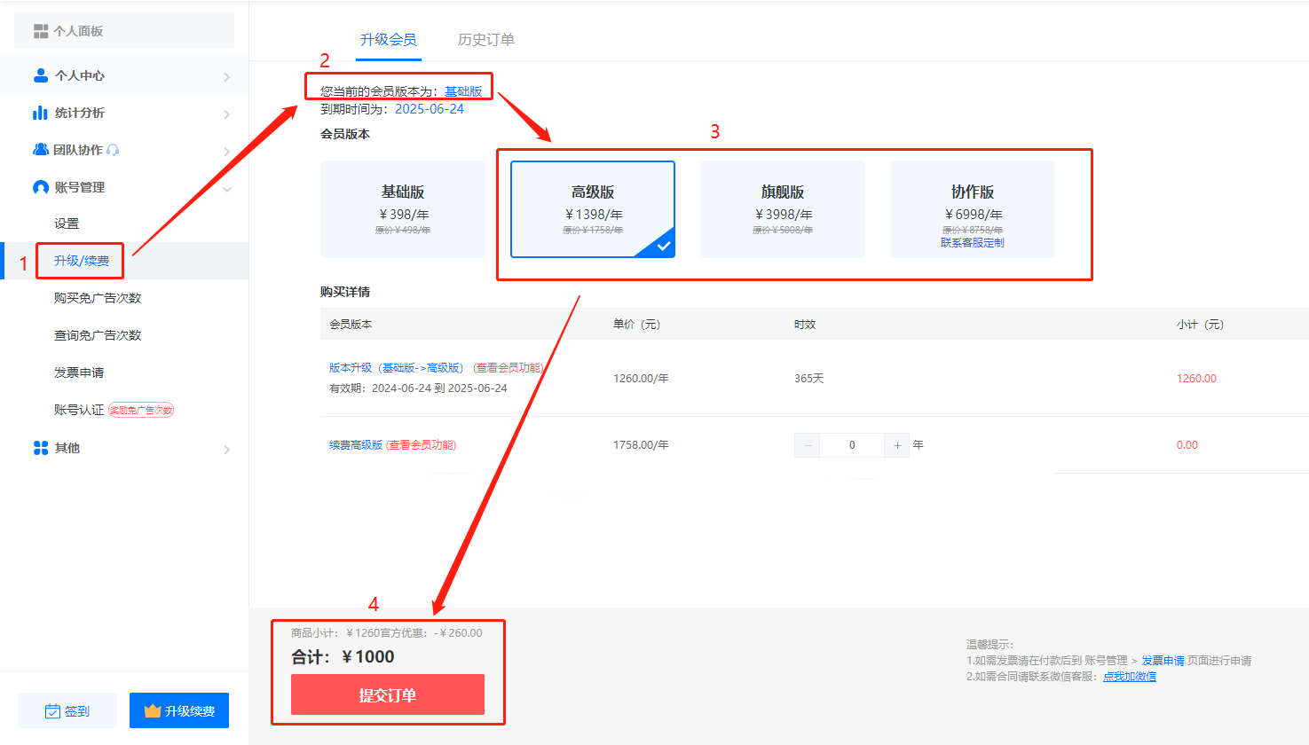 點擊【升級/續(xù)費】,選擇更高級會員,系統(tǒng)會自動計算差價,付款后自動升級。